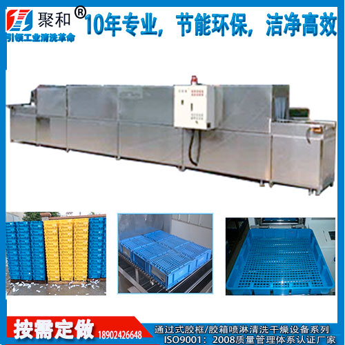 ?佛山聚和牌JH-TGS-L6.5M通过式胶框/胶箱/塑料筐喷淋清洗干燥设备具有性价比高,结构合理,操作方便,清洗效果好的优点,这对于胶框/胶箱/塑料筐的高效清洗、改善劳动环境、减少劳动强度,提高清洗质量,具有重要的意义。?JH-TGS-L6.5M通过式胶框/胶箱/塑料筐喷淋清洗干燥设备利用不锈钢输送链实现胶框/胶箱/塑料筐高效移动,结合喷淋清洗、过水工艺,对胶框/胶箱/塑料筐进行除污清洗,彻底清除胶框/胶箱/塑料筐内外附着的粉尘、杂屑等杂质,胶框/胶箱/塑料筐经风吹干燥后内外无水珠、不变形。佛山聚和牌JH-TGS-L6.5M通过式胶框/胶箱/塑料筐喷淋清洗干燥设备—洁净度要求:按企业现行检验标准检验,胶框/胶箱/塑料筐经喷淋清洗后,内外表面无由无尘、无污渍,干燥后无大片水珠。