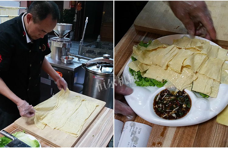 手工鲜豆皮,用豆浆机把豆浆打好加热到沸点,放到豆皮机托盘里,开始加热水产生蒸汽,实现蒸汽加热,再将蒸汽加热豆浆结皮,手工起皮。加热蒸汽包分为电加热、燃气加热二种方式,由自动控温系统、自动加水系统组成。手工鲜豆皮。独特的加工方式,精心设计的挑皮方式,简单易学、操作简单、设备经久耐用。