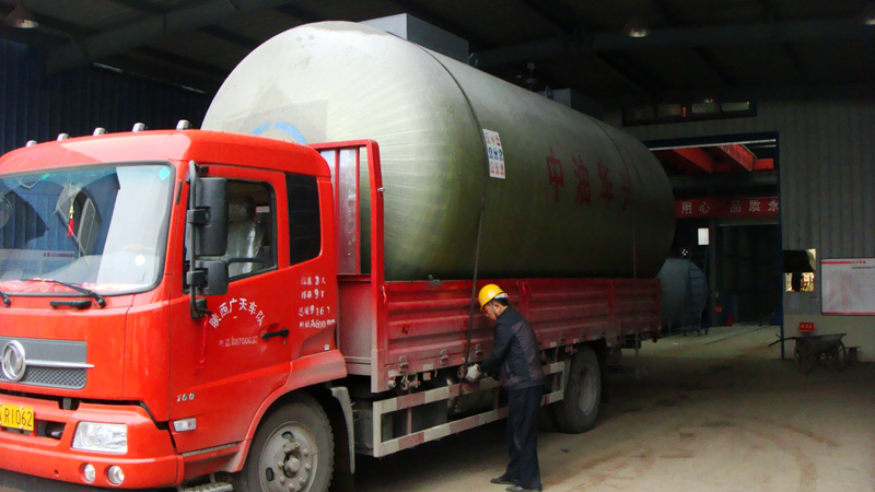 储罐的安装顺序:储罐进入现场后及时验收,察看外表面是否损伤以及气压有无明显变化。(出厂设置为-0.035Mpa)在水泥枕内外均铺上黄砂(禁止用海砂),铺设必须采用人工操作,不允许采用机械方式操作。铺设高度与水泥枕弧底面相平。清理干净水泥枕与储罐配合的弧形位置上的杂质(颗粒物杂质必须≤3mm),防止杂质损伤储罐外层的FRP层;在水泥枕弧形位上必须铺设减震橡胶(厚度≥10mm),以防止储罐的FRP层与水泥枕直接接触造成损伤。在储罐上部的吊点中穿入适合起吊的钢丝绳,然后垂直起吊10mm厚的减震橡胶及塑料薄膜以防止储罐外层受到冲击损伤。枕木位置应避开焊缝及检测管。储罐吊上运输车放置平稳后需再次确认储罐检测压力表是否为-0.035Mpa。