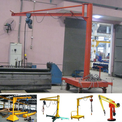 移动式悬臂起重机轻小型悬臂起重机。悬臂起重机 悬臂起重机是近年发展起来的中小型起重装备,结构独特,安全可靠,具备高效、节能、省时省力、灵活等特点,三维空得内随意操作,在段距、密集性调运的场合,比其它常规性吊运设备更显示其优越性。本产品广泛用于各种行业的不同场所。旋臂吊工作强度为轻型,起重机由立柱,回转臂回转驱动装置及电动葫芦组成,立柱下端通过地脚螺栓固定在混凝土基础上,由摆线针轮减速装置来驱动旋臂回转,电动葫芦在旋臂工字钢上作左右直线运行,并起吊重物。起重机旋臂为空心型钢结构,自重轻,跨度大,起重量大,经济耐用。内置式行 旋臂吊MODE型走机构,采用带滚动轴承的特种工程塑料走轮,摩擦力小,行走轻快;结构尺寸小,特别有利于提高吊钩行程。可移动式悬臂起重机立柱位于可移动平台上,扩大了产品的使用面积,可以任意移动至需要到达的地方工作,产品局限性减小,但是受限于底座尺寸可移动式悬臂起重机起重量一般不超过1吨,悬臂长度在4米以内。