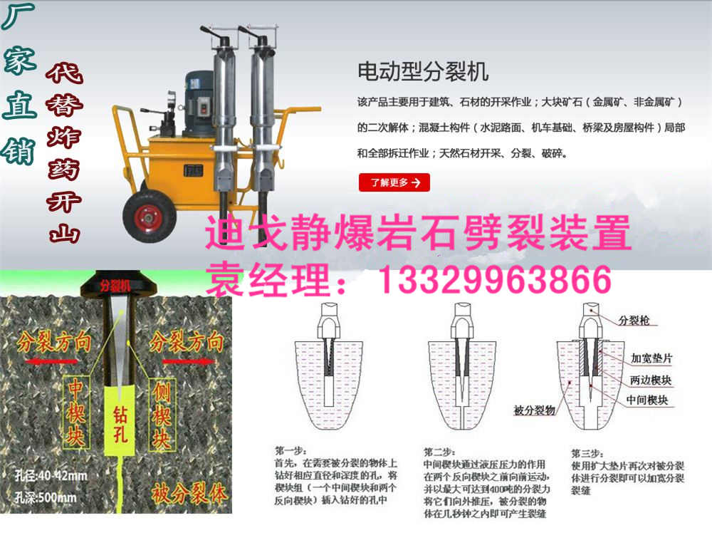 它由泵站和分裂器两大部分组成,由泵站输出的高压油,驱动油缸,产生巨大推力,驱动楔块组中的中间楔块向前驶出,将反向楔块向两边撑开。