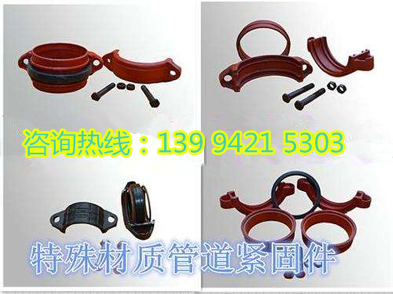 用卡箍的技术要求和材质要求:对于高压卡箍的压力要求需要铸造材质必须是球墨铸铁或者铸钢等,一般使用材质是QT450-12比较合适。球化率要求最低2级要求。C型防老化胶圈需用三元乙丙等防老化材质,保证胶圈50年不老化。 销售热线:139 9421 5303