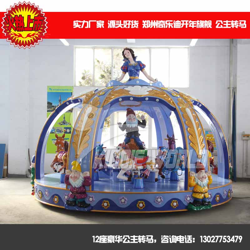 总得来说,奇乐迪在公主转马上做了不少改进,采用拼接式结构,减少了玻璃钢部件的数量,大大增加了玻璃钢装饰部分的连贯性,完美保留了产品设计的艺术性;采用下齿轮传动方式,大大改观了机械设备的稳定性,提高了设备后期维护的高效性;从儿童身边去寻找设计灵感,大胆采用每一个儿童熟知的元素去做产品,大大降低了设备运营的推广成本;适当调整了设备的高度,让公主转马在室内外都能完美运营。