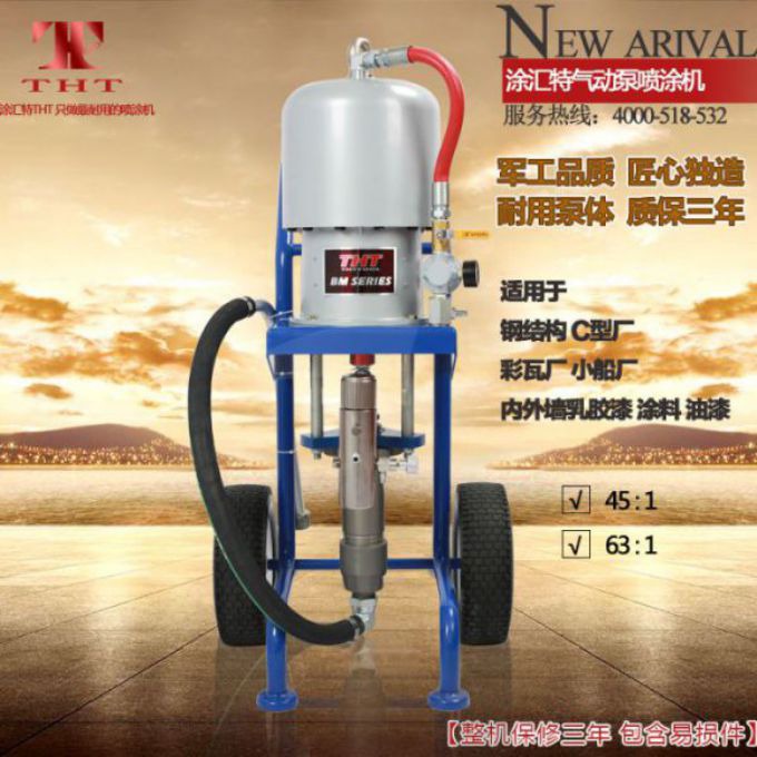 机器特点:采用最新材料黑金刚泵体 耐用性提高十倍 涂汇特喷涂机保修三年 包含易损件