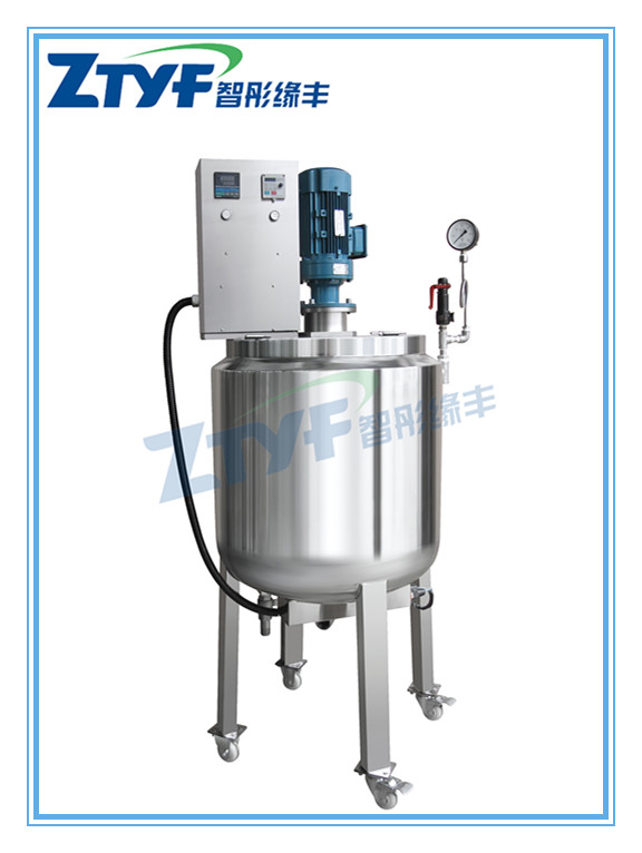 本设备分罐体,罐盖、搅拌浆,进料口,出料阀等组成,与物料接触部位均采用进口316L或304材质,按GMP技术条件制作,罐体内外抛光。罐盖上配有进料口,可与管道连接,便于连接进各种配料,接口采用国际通用ISO标准快装卡盘式。下面出料口为罐底球阀,无卫生死角,搅拌均匀后,旋转球阀手柄即可放料。搅拌轴的密封采用进口卫生级机械密封,最高工作压力可达到0.6Mpa。减速机选用世界著名品牌SEW或国内名优品牌,有多种搅拌器形式可供选择,搅拌转速为30-600rpm可选,采用变频调速器控制。罐体可选择夹套或盘管式加热或冷却,保温材料采用耐高温硅酸铝保温棉。最高工作温度可达230℃。罐体有液位计(无角点超声波、静压变送式或玻璃管式)、CIP万向洗罐、灯窗视镜、若干进出液口、人孔等可选择配备。
