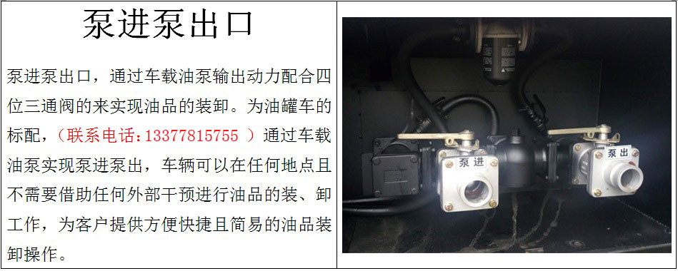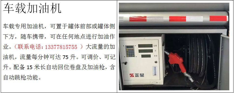 上装配置:罐体实际容积:1.加油机装在车架一侧时,容积为10方,可装8.8吨油;采用5MM厚优质碳钢板材卷压成型,全自动电脑焊接,对罐体严格进行气检、液检、探伤,质量可靠。配备正星大流量加油机,加油机可装仓内或侧挂,标配15米加油管带加油枪。配1个欧标罐口,1个海底阀,配专用油泵,泵进泵出油口,防溢流探杆、油气回收、下装油口,防静电卷盘,爬梯,罐体两侧装液压护栏,输油管,走道,灭火器,工具箱(随车工具)。