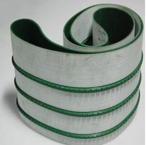 加导条裙边挡板带,绿色导条输送带,环形导条皮带 输送带(conveyingbelt)又叫运输带,是用于皮带输送带中起承载和运送物料作用的橡胶与纤维、金属复合制品,或者是塑料和织物复合的制品。输送带广泛应用于水泥、焦化、冶金、化工、钢铁等行业中输送距离较短、输送量较小的场合。皮带输送机在农业、工矿企业和交通运输业中广泛用于输送各种固体块状和粉料状物料或成件物品,输送带能连续化、高效率、大倾角运输,输送带操作安全,输送带使用简便,维修容易,运费低廉,并能缩短运输距离,降低工程造价,节省人力物力。