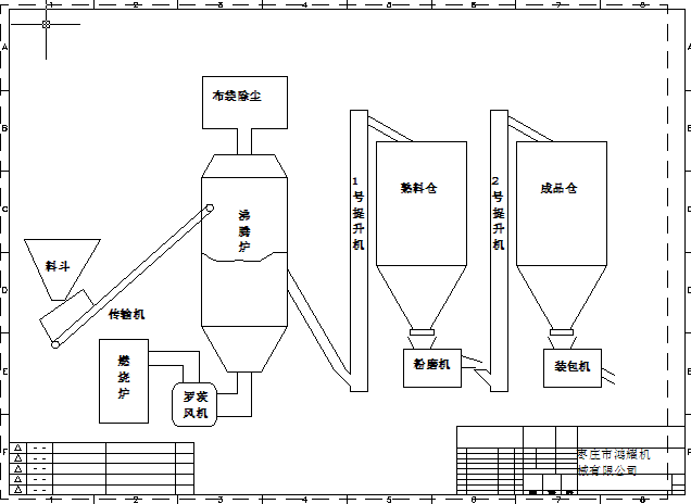脱硫石膏原料堆放,通过铲车送入原料上料机,从皮带运输机进入气流烘干机,烘干后的脱硫石膏在进入FD沸腾炉煅烧。煅烧后通过1号提升机进入熟料仓,熟料仓底部安装均匀给料器进入钢磨进行粉磨,在通过2号提升机进入,成品仓进行包装。