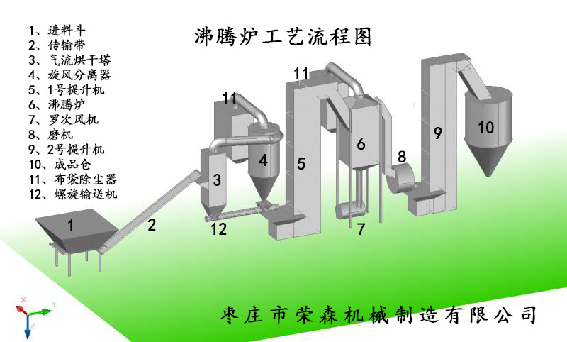FD沸腾炉是立式结构,除尘器套在炉体上方,结构非常紧凑,不但占地少,还避免了除尘器结露。