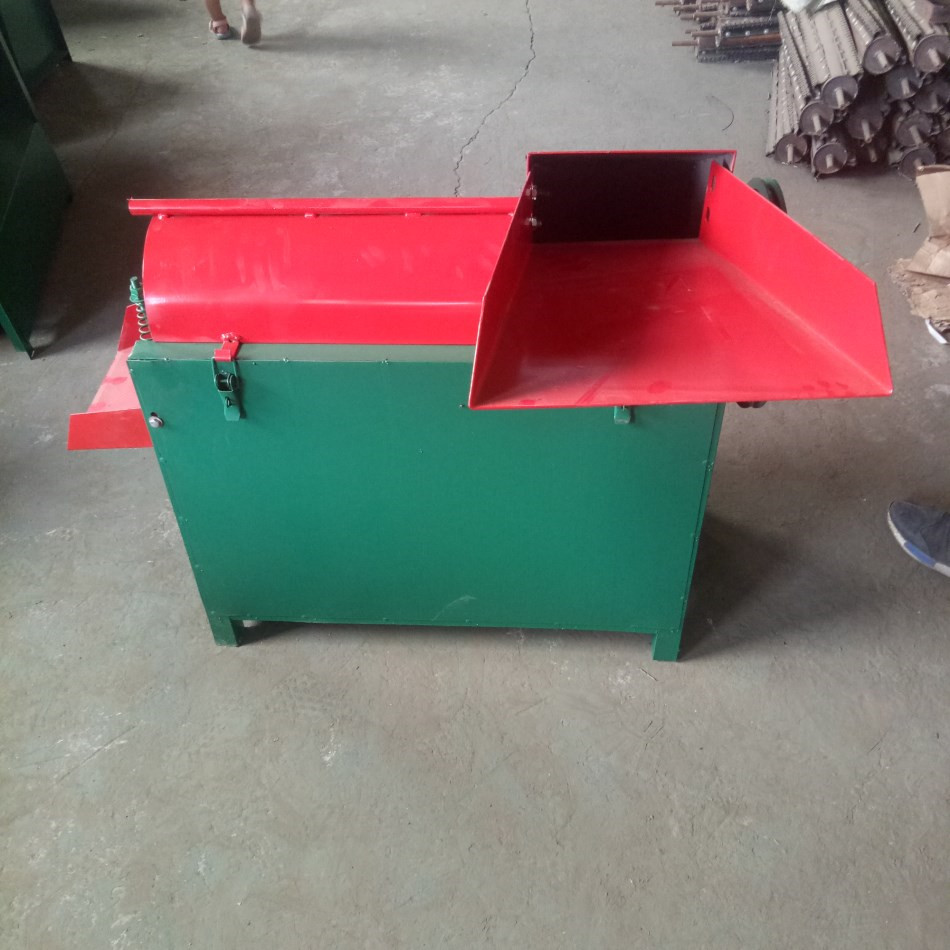 核桃去皮机,属于机械设备领域,包括机壳、底座;驱动马达,底座上安装两个圆柱状铁滚,分别是主动轮和从动轮,二者之间由传送带相连,它们依靠滚珠轴承座的支撑,并随驱动电机不停旋转;置于传送带的上方设有一块固定在底座上的压紧铁板,铁板下表面安装两排刀刃,刀刃离传送带的距离可以调节。该核桃去皮机取代了依靠人力手工操作,提高了工效,显著的节省了人力和时间,解决了核桃成熟期来不及去皮的大量堆集状态。