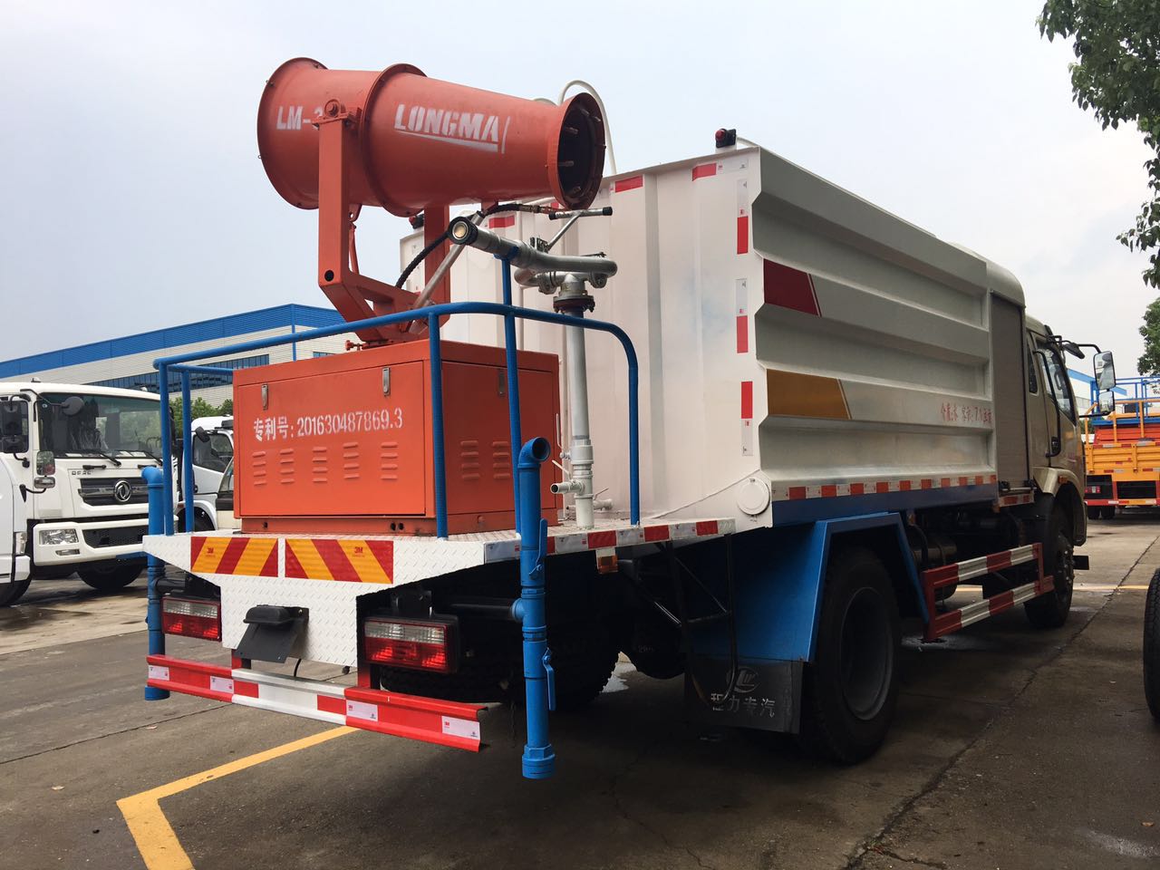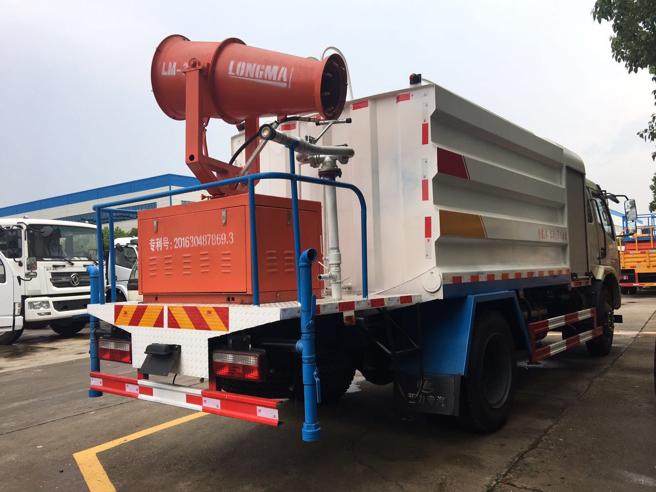 喷雾抑尘车:又称喷雾降尘车,专门用于城市开发区建设工地、拆迁工地、车站储煤场、洗煤厂、焦化厂、铁矿、钢厂、港口等的扬尘风沙控制,喷雾降尘车喷雾作业最远喷水距离为60到100余米,单车最大蓄水量近19吨,主要作用是喷雾抑尘,同时具备洒水和道路冲洗功能,有效抑制扬尘的产生。在城市遭遇雾霾天气、空气质量PM2.5严重超标时,可随意选定一个区域进行液雾降尘、分解淡化空气中的颗粒浓度、将飘浮在空气中的污染颗粒物、尘埃等迅速逼降地面,达到治理净化空气的良好效果。对农场粮棉大面积农作物和果园农药雾化喷洒的工作效率十分高。