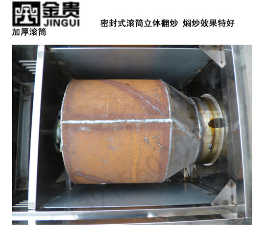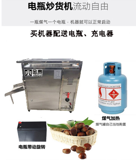 二、多功能电瓶炒货机集各种大中小型炒货机的优点为一体。自动旋转、自动翻炒、自动出锅,机器采用了先进的滚筒卧式结构,滚筒加热均匀,并有保温功能,工作时滚筒不停地旋转,使炒货食品上下、左右、前后、全方位立体翻炒,不会出现粘锅现象,炒制出的食品色泽金红亮丽,香气扑鼻。炒货出入锅十分方便,只需按动正反转开关,电机既带动滚筒反转,炒货和小石子会一同出锅,迅速快捷,省事不费力,干净又卫生。是一种值得广大中小投资者关注的好设备。