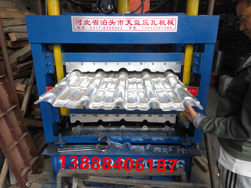 800型琉璃瓦压瓦机设备分为三部分,辊道成型部分、压型部分、切刀部分。辊道成型部分是由电机拖动,链条带动各辊转动。压型部分是液压缸带动模具上下移动,可以把彩钢压成许多节,形似琉璃瓦。切刀部分是液压缸带动刀具上下移动,可以把彩色钢瓦切断。