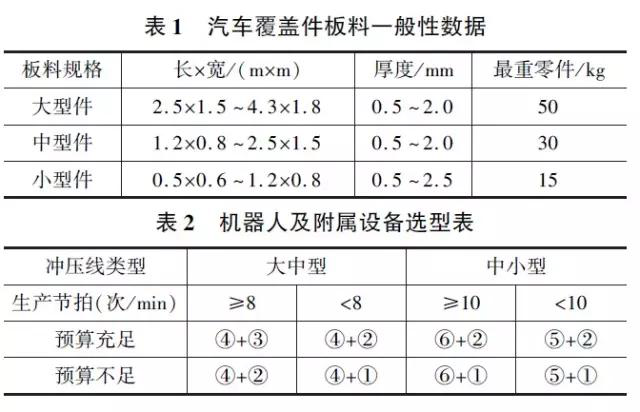 若以“①”代表“旋转180°+标准端拾器”,以“②”代表“旋转7轴+标准端拾器”,以“③”代表“直线7轴+标准端拾器”,以“④”表示“工作空间全面、承载大的机器人”,以“⑤”表示“工作空间全面、承载一般的机器人”,以“⑥”表示“仅有前俯工作空间的机器人”,用户可结合自身的实际情况,参照汽车覆盖件板料的一般性数据(见表1)划分冲压线类型,继而依据生产节拍要求和预算情况选择机器人及其附属设备的搭配方式(见表2),其中,大中型线以大型件的搬运需求来选,中小型线按小型件的搬运特点来选。