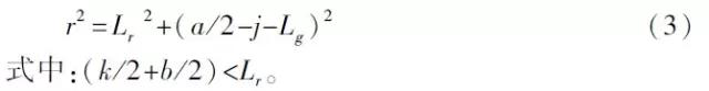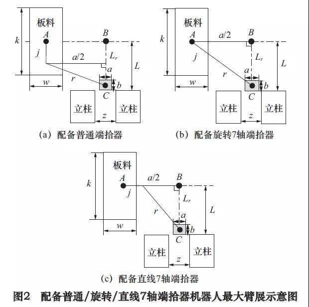 设工作台中心为A,板料此时在工作台的模具内,两压机连线的对称中心为B,机器人底座中心为C,工作台中心到压机立柱内侧距离为L,机器人到两压机中心线的垂距为Lr。并设相邻两压机中心距为a,板料尺寸(长×宽)为k×w,两压机立柱间距为z,机器人底座尺寸(前后×左右)为b×d,工作台中心端拾器辅助加长杆长为j。按普通、旋转7轴、直线7轴端拾器3种情况来求取机器人最大臂展的水平投影r,如图2。