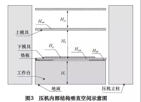 如图3所示,Ht为工作台距地面高度,Hdb为工作台垫板厚度,Hg为工件厚度,Hxc为滑块行程,Hk为压机的最大开模高度,Hsm为上模具高度,Hxm为下模具高度。