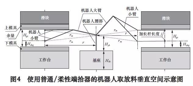 为能让机器人顺利进入压机内取料、放料,设机器人手臂与上下模具间的余量为Hjy(包括安全距离、机器人手臂及手腕高度),则端拾器最大高度Hdsq须满足