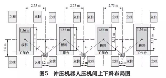 机器人压机间上下料的位置布局如图5所示。由于生产线布局紧凑,因此无需为机器人增设导轨。
