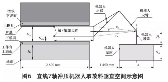 使用普通标准端拾器的机器人手臂须与板料中心线重合,参照图4,为减少手臂伸长幅度,机器人必须靠近两压机中心连线,机器人上下料的干涉余量Hgs应包括伸入压机的机器人手臂高度。若机器人底座高于最高上料位置,则会造成大臂与滑块的干涉,故机器人底座的安装高度应满足如下限制条件