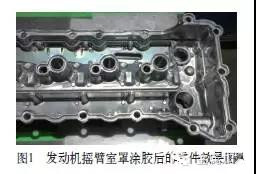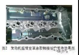 图1和图2是摇臂室罩零件总成,需要在铆接防溅板之前,在铆接结合面进行涂胶,摇臂室罩零件总成装配工艺流程为清洗→压管→涂胶→铆接防溅板→安装密封圈→总成试漏→包装入库。