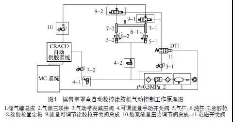 (3)涂胶机气压控制系统设计:图4为摇臂室罩全自动数控涂胶机气动控制工作原理图,本设备所用气源为车间统一气源,气源压力约0.6MPa,为保证设备压力的稳定性,在气源引入端,加装了一个40L的储气罐总成1,压缩空气经过气源三联件2的过滤润滑,再经过调压阀调节到一个需要的稳定的压力(0.5MPa)。设备设计了低压报警功能,当设备进气源低于报警设定值时会进行报警提示操作者。