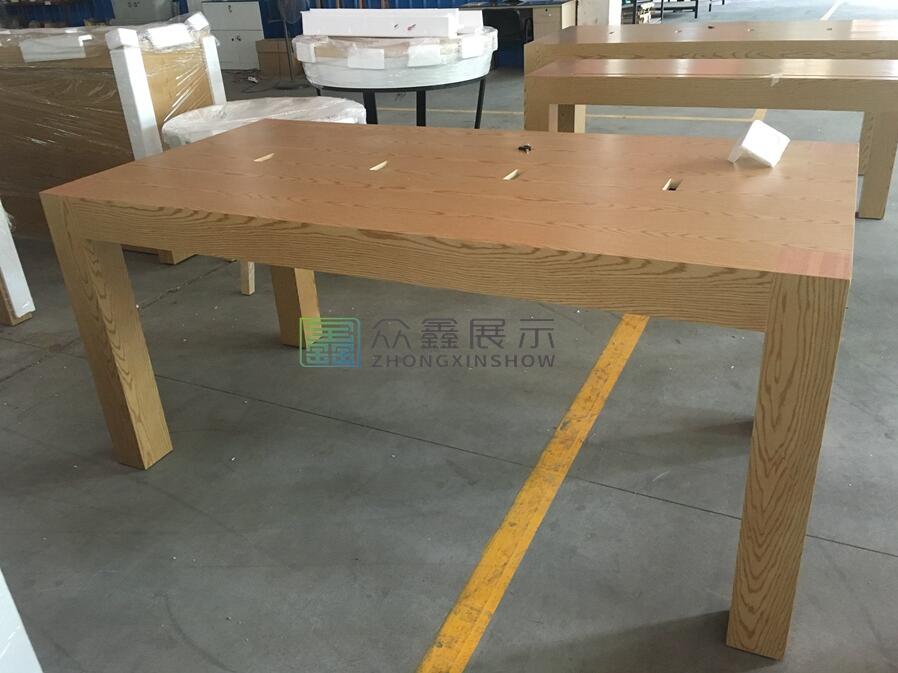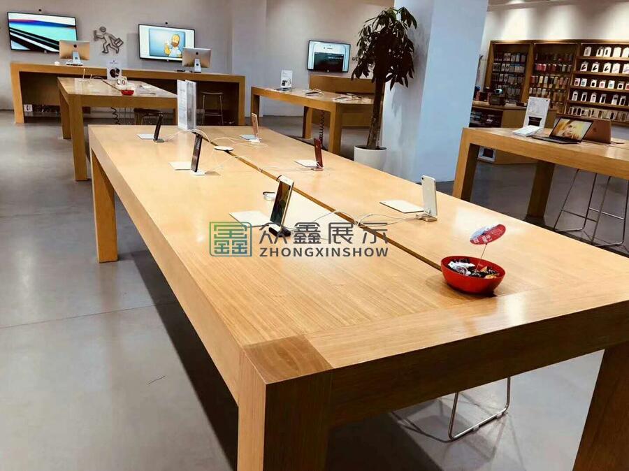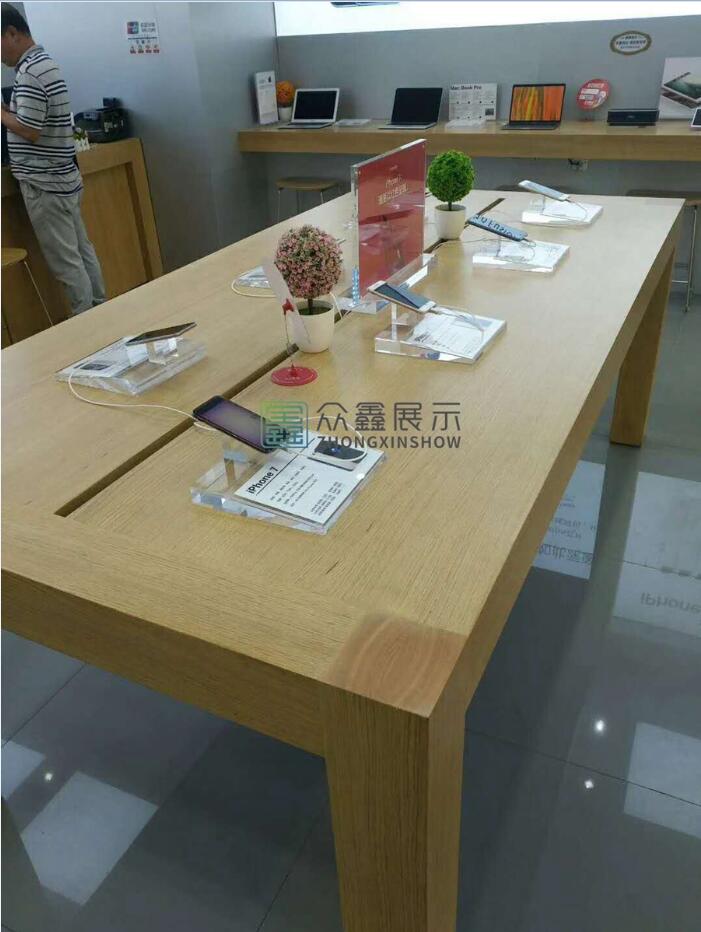 主。现在流行的就两种风格,一种是灰白色调的MONO店,一种就是木纹风的直营店。流行的范围最广的还是木纹系,苹果木纹体验台,木纹配件柜,木纹收银台,木纹靠墙体验柜等。苹果木纹体验台规格一般都是2400*1200*900,四个120*120的桌脚支撑着整个体验台,台面开有8个左右方形出线线槽,底部开有活动板,内部装有电源插板,方便给手机充电和防盗。