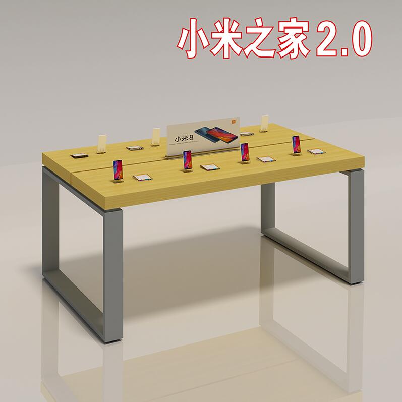 小米原版木纹手机体验台台面材质为白橡木木纹面,底座是五金铁质材质,喷灰色油漆,底座尺寸是1280*700,台面尺寸是1600*900,台面厚度8公分,台面中间按比例开了7个出线圆孔,套有胶垫,底部装有线盒,内装电源插座,小米外接电源线走的是底座方通扁管,从底座众鑫横梁位置接外接电源。