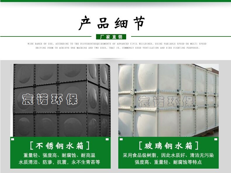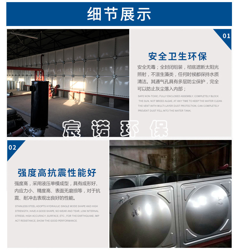 6、与其他类水箱对比,选材优质精良:优质食品级不锈钢SUS304极大延长湘潭消防水箱的使用寿命,并能较好防止水质的二次污染;结构独特合理:高强度的冲压板及箱内分布均匀的不锈钢拉筋使箱体承压均匀合理;施工方便快捷:标准冲压板块1000×1000、1000×500、500×500mm随意装配现场组装焊接,无需吊装设备;箱体轻盈美观:高质量的冲压工艺,既保证了箱体的承压需要,又降低了材料厚度,满足了箱体的美观实用要求。
