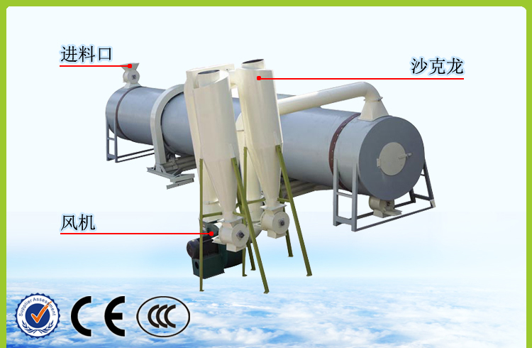 滚筒烘干机机的转筒是略带倾斜并能回转的圆筒体,湿物料从一端上部进入,干物料从另一端下部收集。热风从进料端或出料端进入,从另一端上部排出。筒内装有顺向抄板,使物料在筒体回转过程中不断抄起又洒下,使其充分与热气流接触,以提高干燥效率并使物料向前移动。干燥物料热源一般为热空气、高温烟道气、水蒸气等。