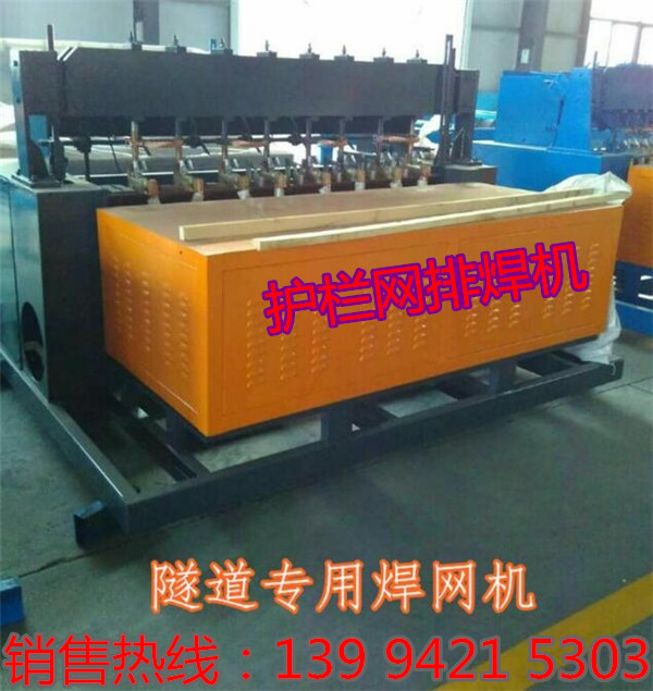 隧道支护网排焊机电动机动力,采用同步控制技术,分控焊接与焊接时间均由数字编程系统控制,输入面板为触摸屏或按键两种,操作更加智能化、合理化,并且具有一次压紧,分次焊接的特点,焊接动力为电动,采用步进电机料斗,制动电机驱动小车送经,步进电机驱动小车拉网。经丝与纬丝均由校直机校直切断,竖丝人工摆放,横丝自动落丝。