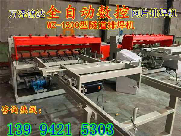 隧道支护网排焊机电动机动力,采用同步控制技术,分控焊接与焊接时间均由数字编程系统控制,输入面板为触摸屏或按键两种,操作更加智能化、合理化,并且具有一次压紧,分次焊接的特点,焊接动力为电动,采用步进电机料斗,制动电机驱动小车送经,步进电机驱动小车拉网。经丝与纬丝均由校直机校直切断,竖丝人工摆放,横丝自动落丝。