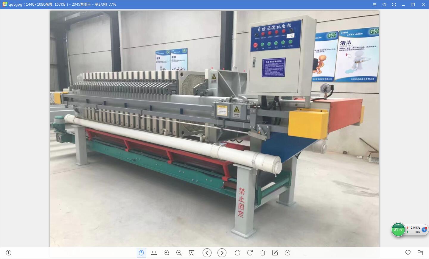 1、调试正常的压滤机方可进料工作,每班工作前要对整机作全面检查。机械压紧传动部件及减速箱必须加足润滑油;液压压紧复查油箱贮油量及液压站工作压力,液压油一般每年更换一次,隔膜压滤机 更换时应对液压系统作—次全面清洗,液压站工作压力小于油缸最高工作压力,但最小不能低于过滤压力允许值,过小会引起较大渗漏,过大会损坏机件。
