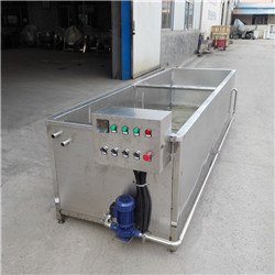 解冻机用于-18度的冻鱼板,鸡鸭禽类或冻制食品,水产品的解冻。将产品(板、块)等料放进加满水的解冻池,用气泡将水快速翻腾,让产品在解冻池内相互碰撞,相互摩擦,从而达到快速解冻的目的。解冻池旁边有恒温池,水从恒温池流入解冻机入料口处,随着冻品的化冰解冻,网链上的产品向出料方向出料,解冻池内的水温慢慢下降,到出料这段时间,水再从解冻池进入到恒温池,这样循环利用,起到对水资源的节约,又能环保,减少对环境的污染。保持水资源的循环利用,提高水资料选用率。使用全自动变频型节水解冻机流水线设备既能降低成本,又能提高工作效率。