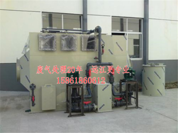 废气由风管吸入,自下而上穿过填料层;循环吸收剂由塔顶通过液体分布器,均匀地喷淋到填料层中,沿着填料层表面向下流动,进入循环水箱。由于上升气流和下降吸收剂在填料中不断接触,上升气流中流质的浓度越来越低,到塔顶时达到排放要求。
