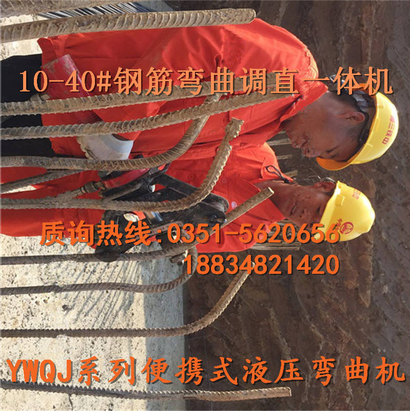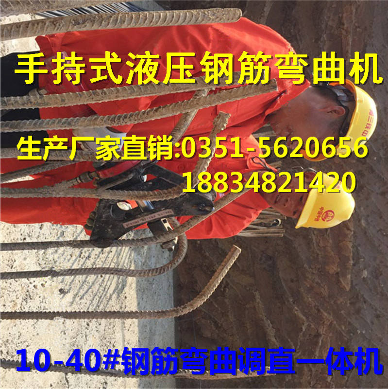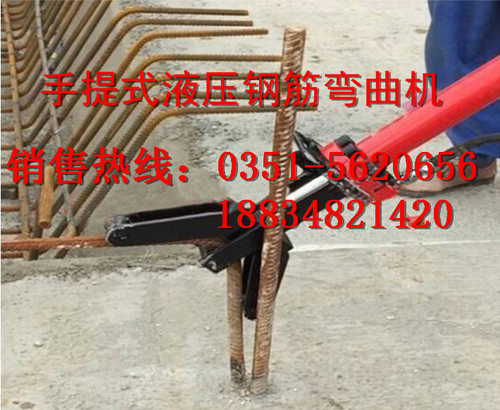 手提液压弯曲机为连环筋工为配合钢筋笼滚焊机使用而研发的选备机件之一,供购买钢筋笼滚焊机之前未置有该类机械选配;该机主要功能为将较大直径钢筋(16mm以上)在成品的钢筋施工件(如钢筋笼、承台、立柱等场合)钢筋末端折弯出一定角度(直角或其他角度,根据所选用的弯曲模决定),其采用了液压弯曲动力,弯曲头与液压源采用软质连接管连接,弯曲头灵活进行弯曲作业,与传统将钢筋弯曲后运至现场绑扎作业相比,该机可在绑扎成型后现场弯曲,应用十分灵活!