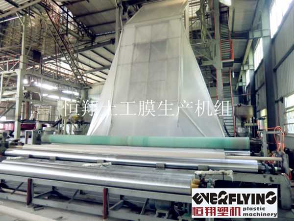 该设备主要用于生产三层复合塑料宽幅防渗膜、土工膜等产品。主要由三台挤出机、液压不停机快速换网装置、三层复合机头、双风口风环、牵引机、卷取机、温度与电器控制等系统组成。