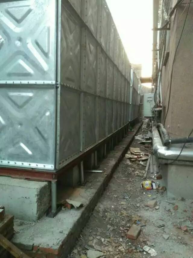 2、水箱四周应不少于500mm 的通道,箱底及箱顶不少于600mm,箱底及附件均采用热镀锌;