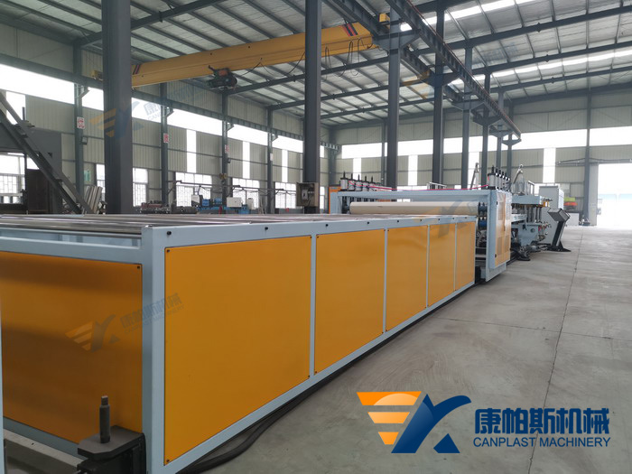 PP中空建筑模板设备分为一模单出及一模双出,并且分为共挤及单出机型. PP中空建筑模板一模双出生产线是在传统915mm单出生产线的基础上,经过不断创新,不断验证后,推出的全新产品,在满足大产量,低能耗的同时,提高产品质量的稳定性. 共挤通过三层复合分配器两套挤出机共挤,产品上下表面材料可以复合均匀,复合厚度可以根据需要灵活调整. 模具芯棒采用新型的三层方格结构模具内部流道采用双流道设计,确保物料挤出的稳定性.PP中空建筑模板设备定型装置采用三级定型板设计,可以满足高速生产时的产品稳定,均匀先进的真空设备,新型的冷却流道设计,提高产量的同时,产品冷却更迅速.双牵引设备降低开机不合格产品的产生,牵引力更合理,产品平整度更高.全自动化的切割装置,切割精度更高,合金锯片,减少切割毛刺.