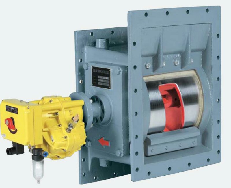 转子的衬垫安装在不直接接触物料流的位置。由电动执行器驱动,带有力矩开关。阀体上带有特殊的合成纤维带孔的充气板。气源的接头半么为1/2".阀上有安全联结器,用于手动操作。带法兰垫。