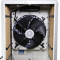 移动式环保空调又叫移动式水冷机,是运用“水蒸发吸收热量,蒸发面积影响增发效率”的自然物理现象,由表面积很大的特种纤维波纹蜂窝状湿帘、高效果能风机、水循环系统、浮球阀补水装置、机壳及电元器等组成。未饱和的空气流经多孔、湿润的水帘表面时,大量水分蒸发,空气中由温度体现的显热转为蒸发潜热,从而降低温度自身的温度。该款空调具有时尚、轻便、灵巧等个性魅力,机壳底座安装了4个轮子,可随心所移,让凉爽跟着走。