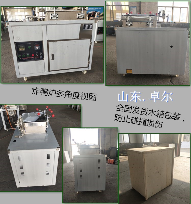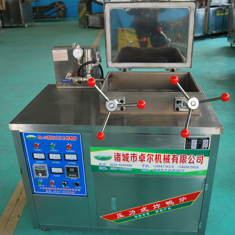 本厂生产的卓尔系列压力炸鸭(鸡)炉,根据西式炸鸡,鸭和传统的中式烤鸭的生产工艺特点而制,整体不锈钢材质、电子定时、自动控压排气。采用低温高压原理,台面设计成油盘式结构,避免了台面油外流的缺点,具有自动控温、定时、自动控压排气,超压保险等功能。炸制的食品外酥里嫩,色泽鲜明,香气扑鼻,能保持食物的原有营养成分。