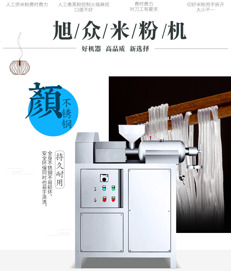 SZ-60不锈钢米粉机,可生产米粉、米线、桂林米粉、过桥米线、年糕、糍粑等产品。各种形状都可生产(圆、扁),加工食品外表光滑,厚薄、宽窄、粗细均匀可调,筋软适度,有弹性,口感柔软、味道纯正。