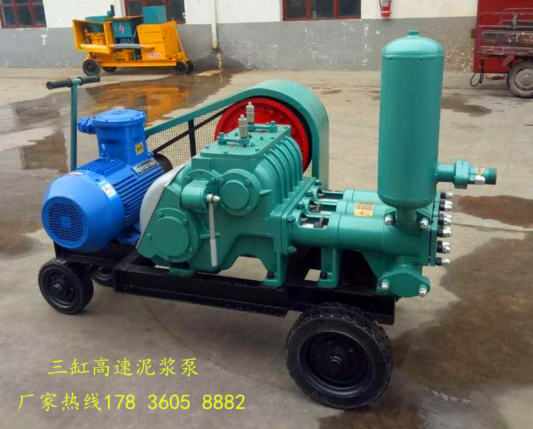 泥浆泵为卧式三缸往复单作用活塞泵,可变换八种不同压力和流量。排量和孔深根据用途随意调节,用于地质岩心钻探工程中向钻孔输送冲洗液泥浆清水皂化夜.深可和1500米钻机配套使用,也可用于水泥浆灌注,本泵耗能少,操作简单,分解性好,易于搬迁。