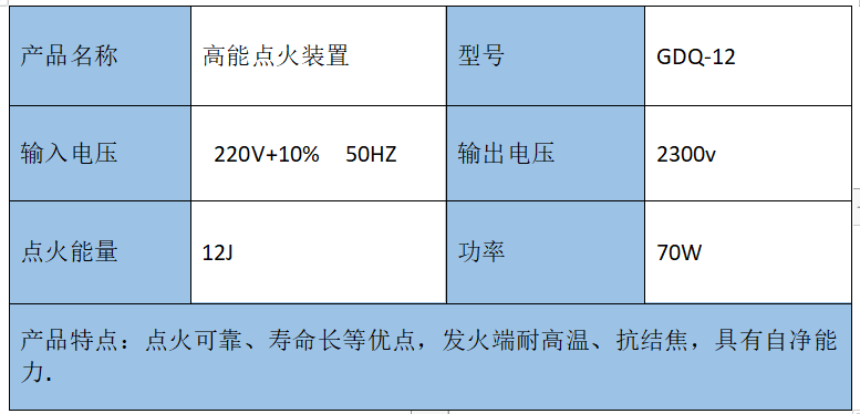 2.该系列点火装置由箱体,专用高压硅橡胶电缆和点火杆三部分组成。安装时将点火装置箱体和点火杆用专用高压电缆连接即可,电源220V.AC