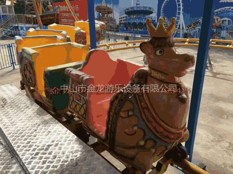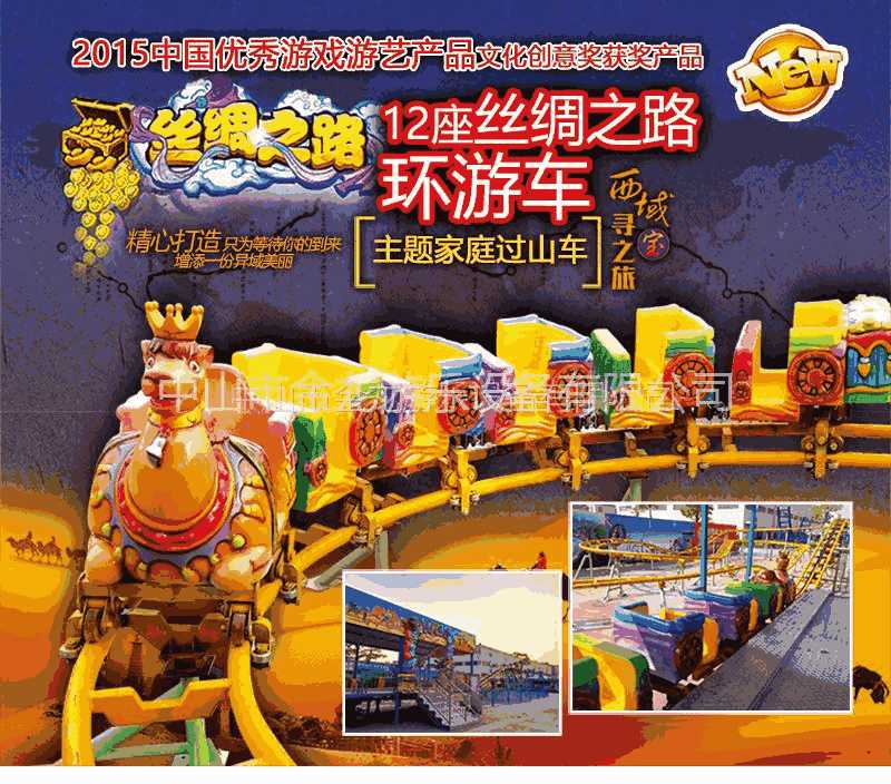 12座丝绸之路环游车是中山金龙游乐设备公司最近新研制开发的滑行类游艺机,其运行机理类似于松林飞鼠,属滑行类的游乐设备。其主要构成为车身、路轨、固定安装在路轨上的驱动装置、液压刹车装置、电气控制系统、站台等六大部份。运行时,驱动装置通过摩擦轮将电动机的动力转换为飞车的运动,并将飞车送至轨道的点。以一定的初速度送出,再靠消耗飞车自身的动能和势能来克服摩擦力沿轨道滑行,直至站台再次加速或经两级刹车平缓刹车至停止。且由于路轨曲折多变,决定飞车运行速度的多变性,并产生适当的离心力及失重感,犹如乘坐宇宙飞船在太空中旅行一般,受到广大游客的欢迎。