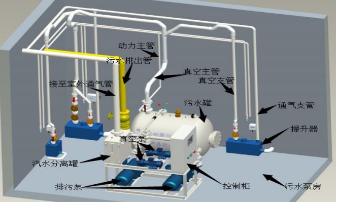 用于市政污水收集的真空排水系统,包括真空集水单元、真空管道系统、真空泵站和控制系统,来自各排水单位的污水通过重力自流进入真空集水单元中的集水箱,通过设置在集水箱上的真空阀进入真空管道系统,然后进入真空泵站内的气水罐,气水罐顶部连接真空泵,通过真空泵抽气气水罐上部的空气,气水罐底部连接排水泵,通过排水泵将进入气水罐中的污水排出。在真空管道系统连接真空集水单元的真空管道末梢设置排空管并控制排空管的补气,以降低在真空管网末梢维持较高真空度的需求,从而取消或降低系统内设置大型真空储能装置的需求以及取消或降低真空储水罐下沉安装的需求。控制系统包括就近设置的真空集水单元PLC控制柜和真空泵站PLC控制柜以及中央控制台,各真空集水单元PLC控制柜和真空泵站PLC通过通讯线路与中央控制台连接,中央控制台与互联网连接。对真空排水系统的控制包括优先度依次降低的三种方式,即现场手动控制、中央控制台手动控制和PLC程序控制,操控人员可与中央控制台进行数据通讯并远程操控真空排水系统的运行。