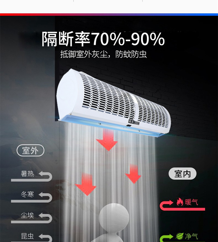 本公司主要经销产品品种多,规格齐,有薄型风幕机,有豪华圆弧型风幕机,有强出风风幕机,有遥控型风幕机,有热风幕,水汽风幕,不锈钢风幕,防爆风幕及、管道风机、负压风机、移动空调、冷风机等等,产品适用于商场、连锁超市、连锁企业、食品行业、冷库、制药行业等商业场所能有效隔离外冷热空气的对流,防止粉尘昆虫的进入。