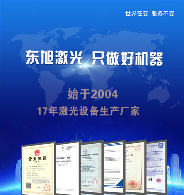 公司产品涵盖激光雕刻、激光切割、激光裁剪、激光打标、激光雕版等几大系列的激光设备,东旭激光凭借着多年的经验逐步研发了适用于各行各业的专业机型,并以其优异的配置、稳定的性能、鲜明的性价比和优质的服务,被行业内和国内外老客户所认可。公司与全国数家有实力的工艺品加工、服装制作、广告制作等公司成立了良好的合作关系,并不断优化产品功能和服务措施,力争为客户创造可靠耐用的激光加工工具和更加优质快捷的服务。本着“世界在变,服务不变”的服务宗旨,努力于激光设备制造行业。