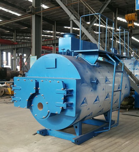 WNS型燃油气蒸汽锅炉采用卧式标准三回程结构形式,燃烧方式采用微正压燃烧。锅炉本体由锅筒、炉胆(波形炉胆)和两回程烟管组成。锅筒内装有汽水分离装置和给水装置,下部装有定期排污装置。燃料在燃烧器内与空气混合后被电子点火棒点燃,喷入炉胆中燃烧,高温烟气由炉胆进入两级对流管束,由后烟箱通过烟囱排向大气。