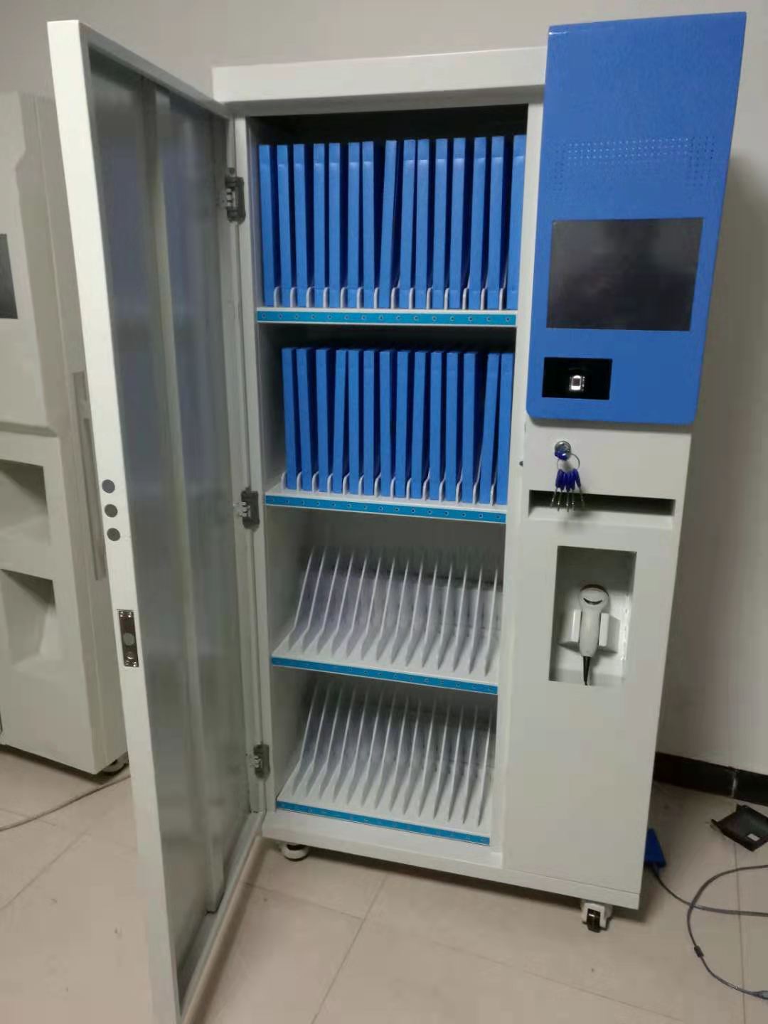 柜体装有电控锁,通过RFID卡或指纹、密码等进行开门权限管理。